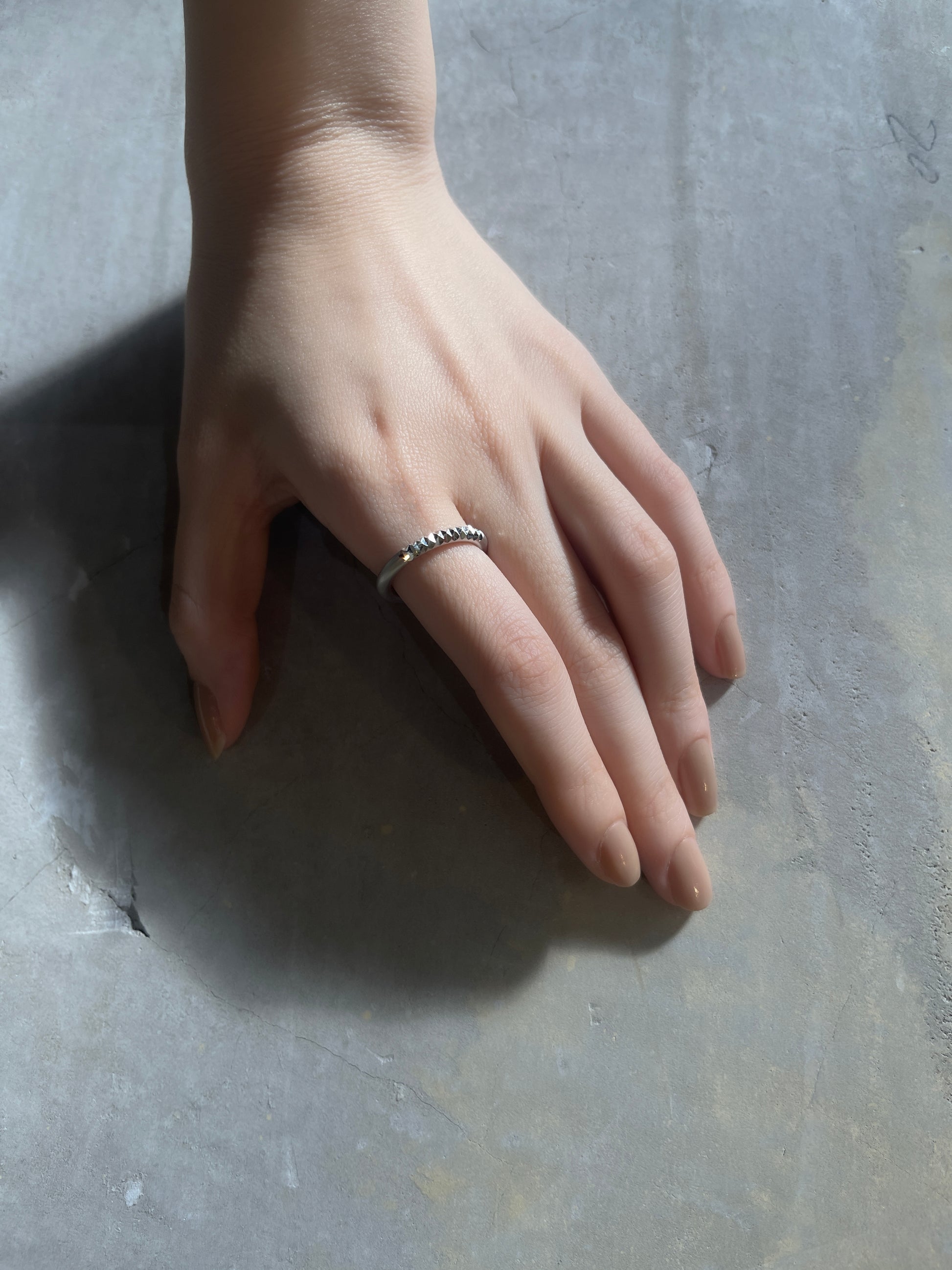 Φ2.8mm 반지의 1/4을 잘라서 장식한 반지입니다. 둥근 곡면은 차분한 질감의 무광 마감 처리되어 있으며, 발굴된 부분은 거칠지만 눈부신 광택이 있어 아름다운 대비를 이루는 반지입니다. 특수 굴삭기를 사용하여 조각한 것으로, 각인된 부분이 눈부시게 반사됩니다. Radiohead의 앨범 "KID A"에서 영감을 받은 아이템입니다. *표시된 손가락 크기 이외의 손가락 크기도 제작 가능합니다. 부담 없이 문의해 주십시오.