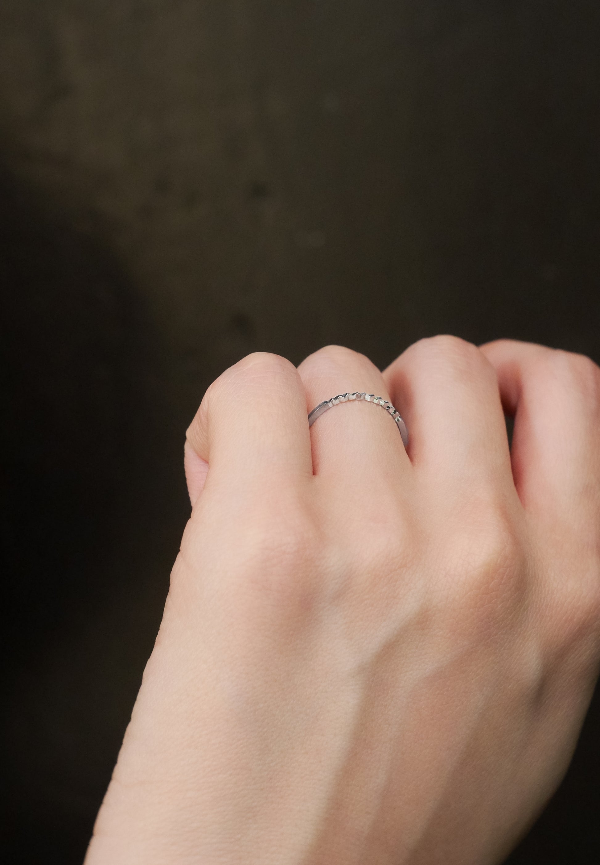 Φ1.2mmの角線リングの1/4部分を彫り出して装飾を施したリング。丸い曲面はマット仕上げで落ち着きのあるテクスチャー、掘削した部分は荒々しくもまばゆい輝きを備え、その対比が美しいリング。特殊な掘削機で彫刻しており、彫られた部分は眩く反射します。 Radioheadのアルバム『KID A』からインスピレーションを得たアイテム。