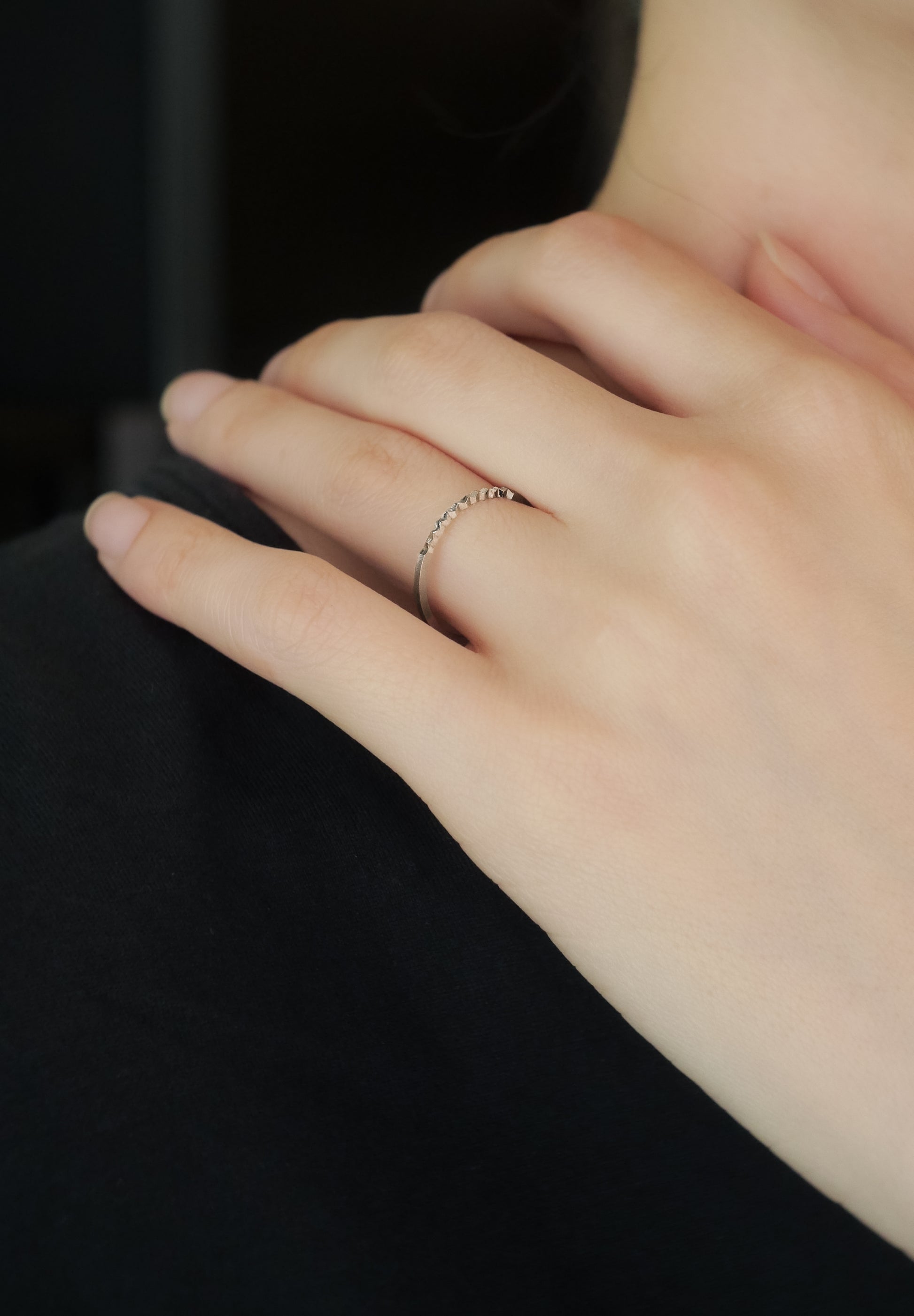 A Φ1.2mm square wire ring with a quarter section carved out and decorated. The round curved surface has a matte finish with a soothing texture, while the excavated portion has a rough but dazzling shine, creating a beautiful contrast between the two rings. It is carved with a special excavator, and the carved areas are dazzlingly reflective. This item was inspired by Radiohead's "Kid A" album.
