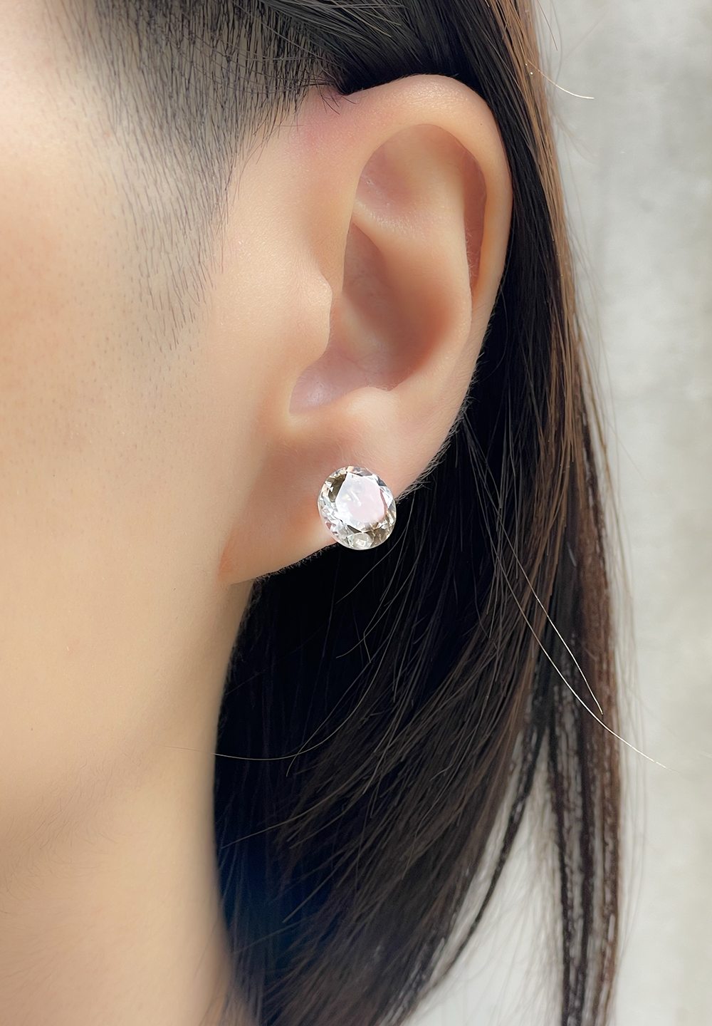 ホワイトトパーズのラウンドカットのピアス、オプティクス(OPTICKS)。石枠を使わず、ラウンドカットの石にさらに加工を施し、石そのものが耳に装着されるようにデザインされている。一切の無駄のない、半貴石のピュアネスを身につけるミニマルなデザイン。